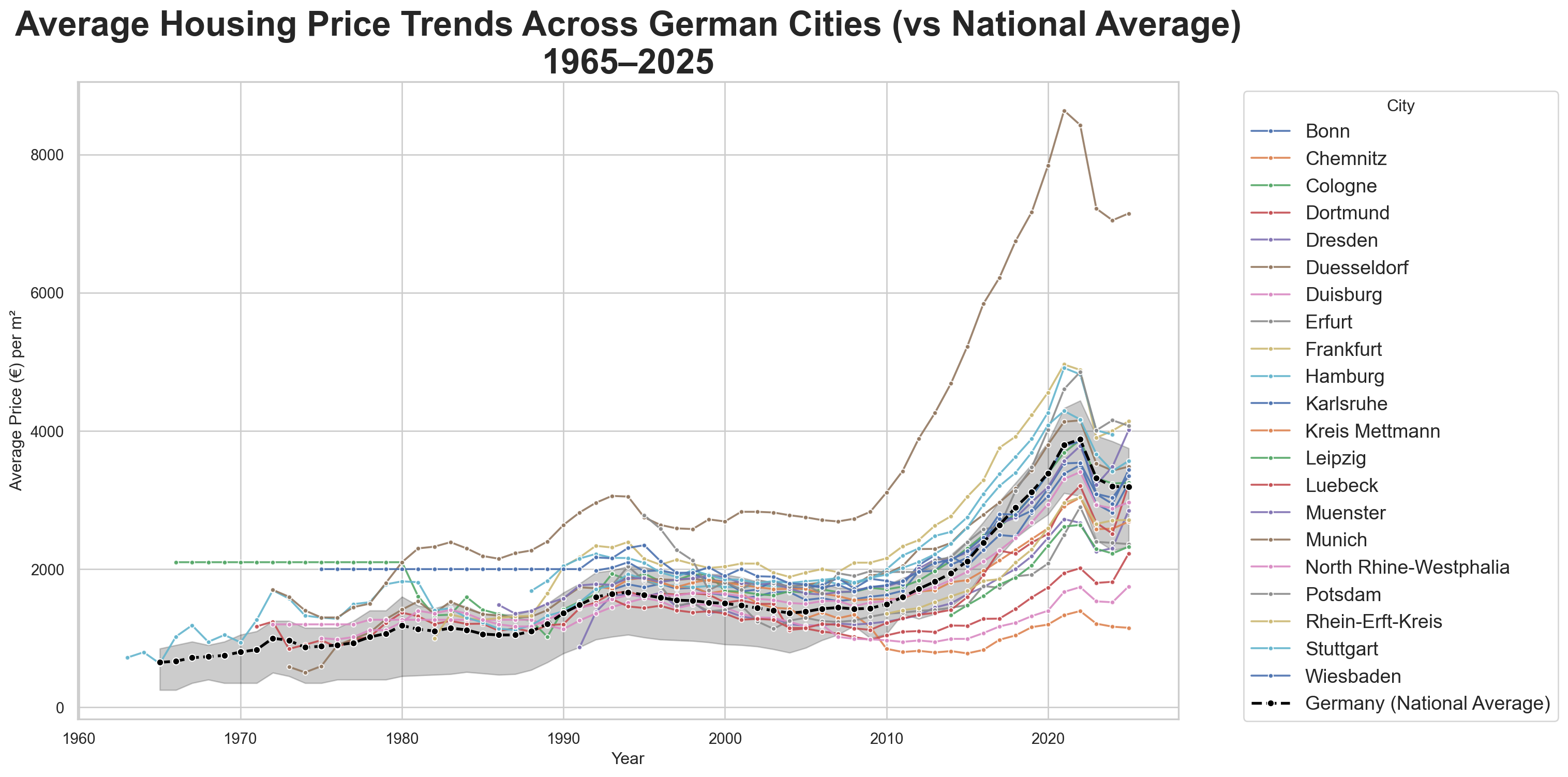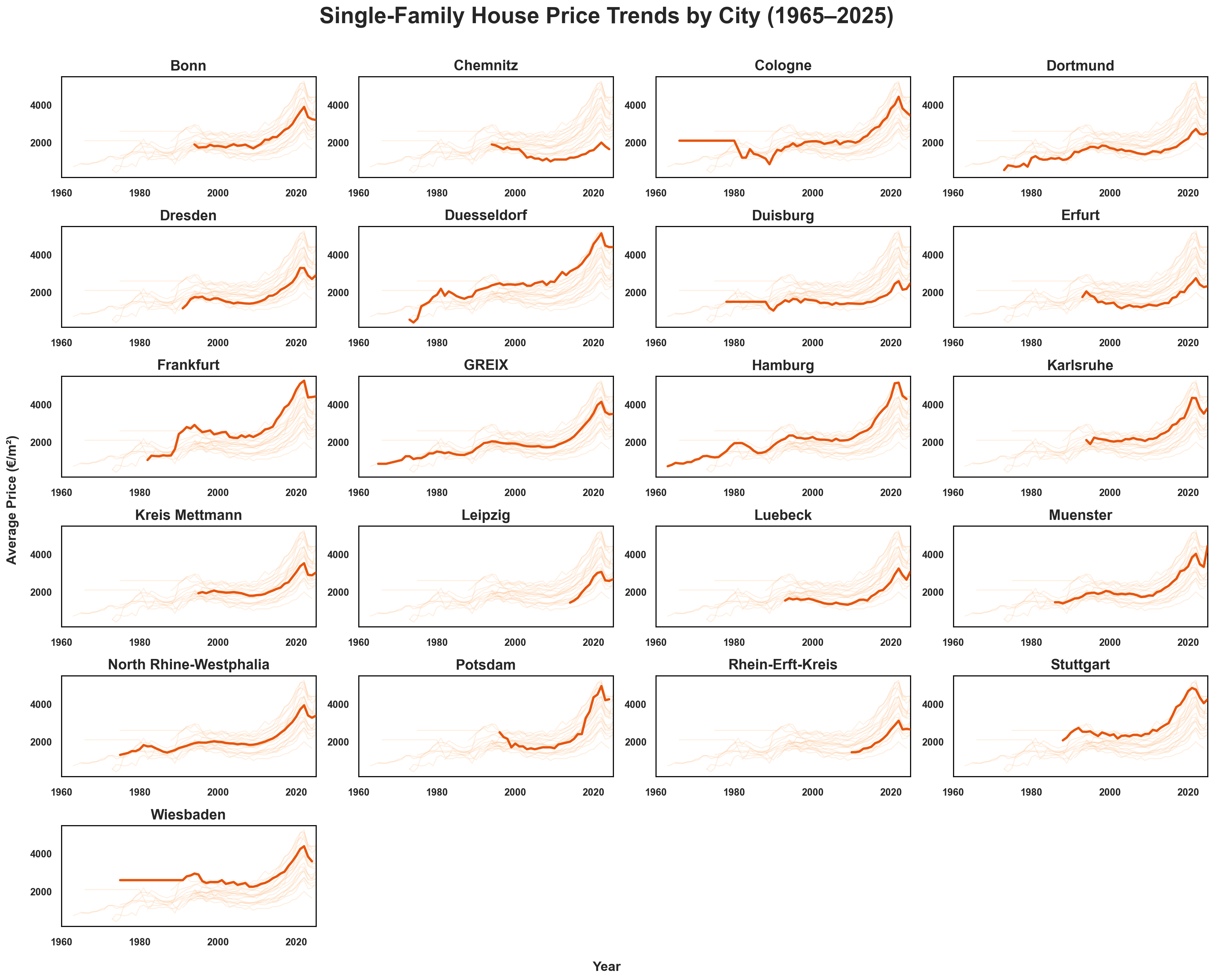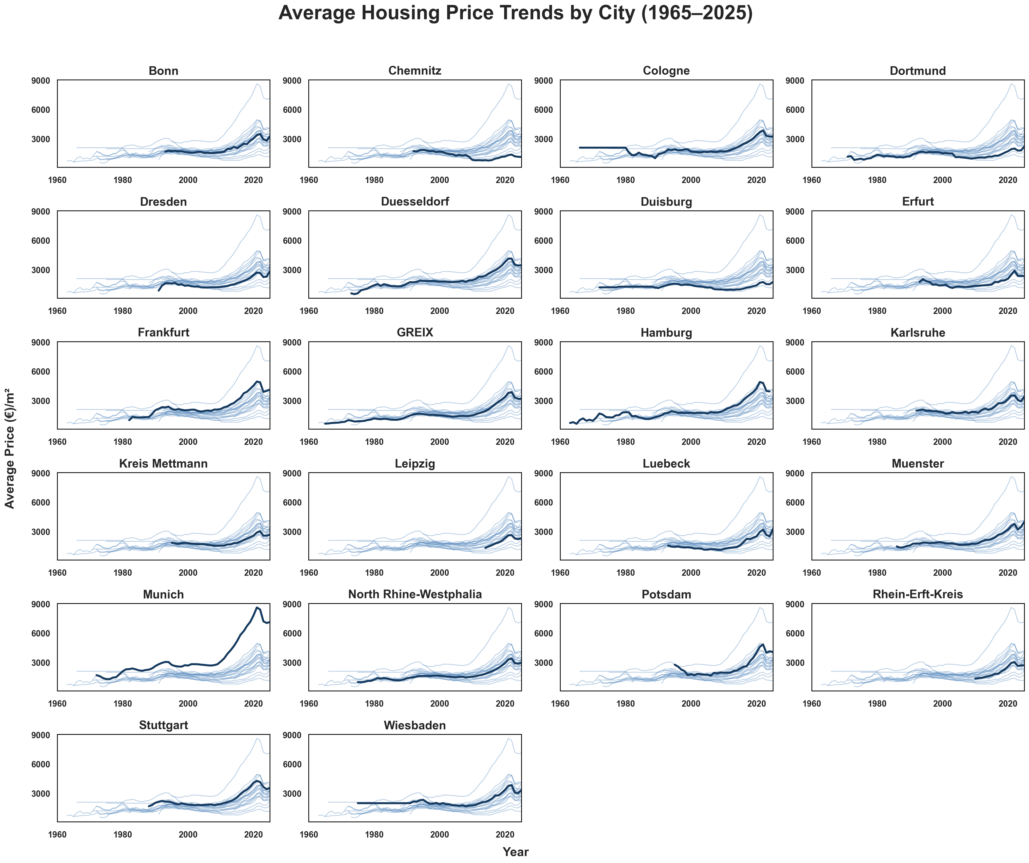 Figure 2: Average housing price trends for each German city, 1965–2025. Each panel highlights one city’s trajectory, showing how some cities track the national trend closely while others diverge substantially in recent years.