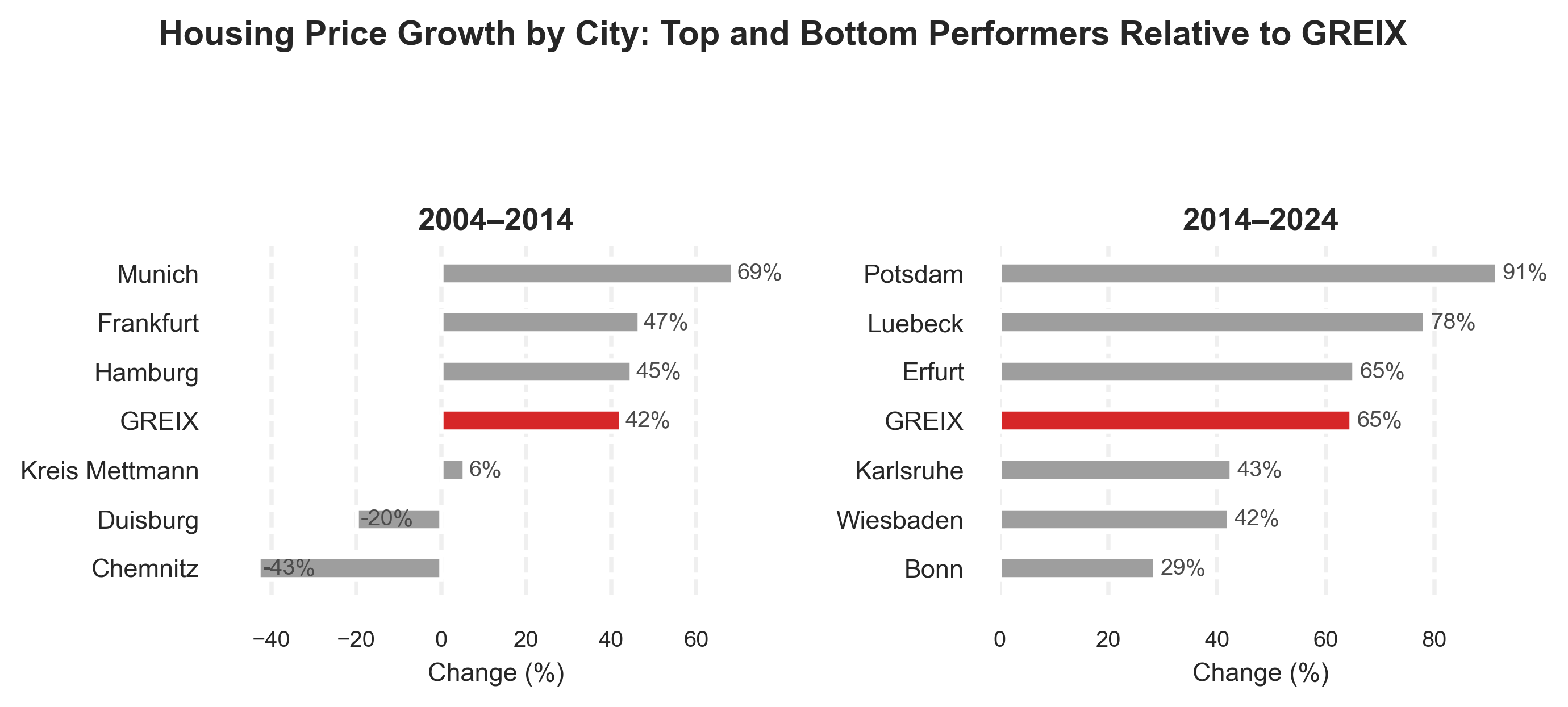 city_year = ( yearly_prices .groupby(["City", "Year"], as_index=False)["Price"] .mean() .dropna(subset=["City", "Year", "Price"]))city_year["Year"] = pd.to_numeric(city_year["Year"], errors="coerce").astype(int)wide = ( city_year[city_year["Year"].isin([2004, 2014, 2024])] .pivot(index="City", columns="Year", values="Price"))pct_table = pd.DataFrame(index=wide.index)pct_table["Pct_2004_2014"] = (wide[2014] / wide[2004] -1) *100pct_table["Pct_2014_2024"] = (wide[2024] / wide[2014] -1) *100pct_table = pct_table.dropna()def get_top_bottom(df, col): g = df.loc["GREIX", col] d = df.drop("GREIX") top3 = d[d[col] > g].sort_values(col, ascending=False).head(3) bottom3 = d[d[col] < g].sort_values(col, ascending=False).tail(3) out = pd.concat([top3, df.loc[["GREIX"]], bottom3])return out.index.tolist(), out[col].tolist()cities_0414, values_0414 = get_top_bottom(pct_table, "Pct_2004_2014")cities_1424, values_1424 = get_top_bottom(pct_table, "Pct_2014_2024")red ="#d62728"grey ="#4b4b4b"def plot_panel(ax, cities, values, title): y = np.arange(len(cities)) colors = [red if c =="GREIX"else"#9e9e9e"for c in cities] ax.barh(y, values, color=colors, height=0.45)for i, v inenumerate(values): ax.text(v +1, i, f"{v:.0f}%", va="center", fontsize=8, color=grey) ax.set_yticks(y) ax.set_yticklabels(cities, fontsize=9) ax.invert_yaxis() ax.set_title(title, fontsize=11, fontweight="bold") ax.set_xlabel("Change (%)", fontsize=9) ax.tick_params(axis="x", labelsize=8) ax.grid(axis="x", linestyle="--", alpha=0.3)for s in ax.spines.values(): s.set_visible(False)fig, axes = plt.subplots(1, 2, figsize=(8, 3.6), dpi=180)plot_panel(axes[0], cities_0414, values_0414, "2004–2014")plot_panel(axes[1], cities_1424, values_1424, "2014–2024")fig.suptitle("Housing Price Growth by City: Top and Bottom Performers Relative to GREIX", fontsize=12, fontweight="bold", y=0.98)plt.tight_layout(rect=[0, 0, 1, 0.92])plt.show()