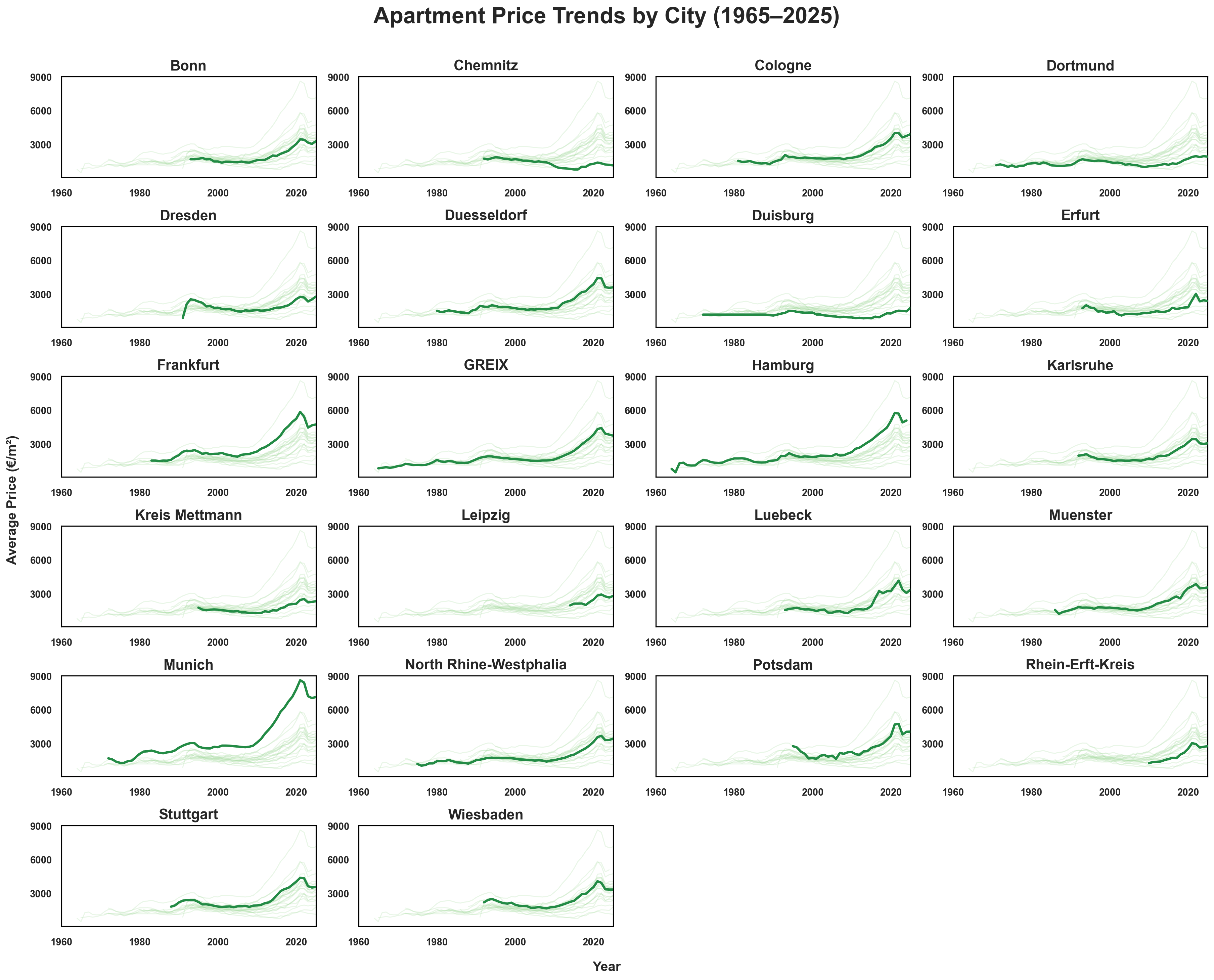 Figure 15: City by city price trends for German residential properties 1965–2025. Each panel highlights a single city’s trajectory (bold) with all other cities shown as faint context lines. This visualization reveals both national patterns and apartment segment.
