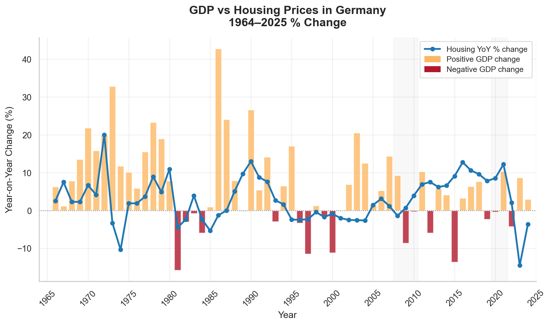 Several periods of negative GDP growth do not coincide with strong declines in housing prices. In many years, housing prices continue to grow even when GDP contracts, or react only mildly. This is particularly visible in the early 1990s, the late 1990s, and around the global financial crisis. These patterns indicate that short-term housing price movements are not tightly linked to short term changes in GDP.