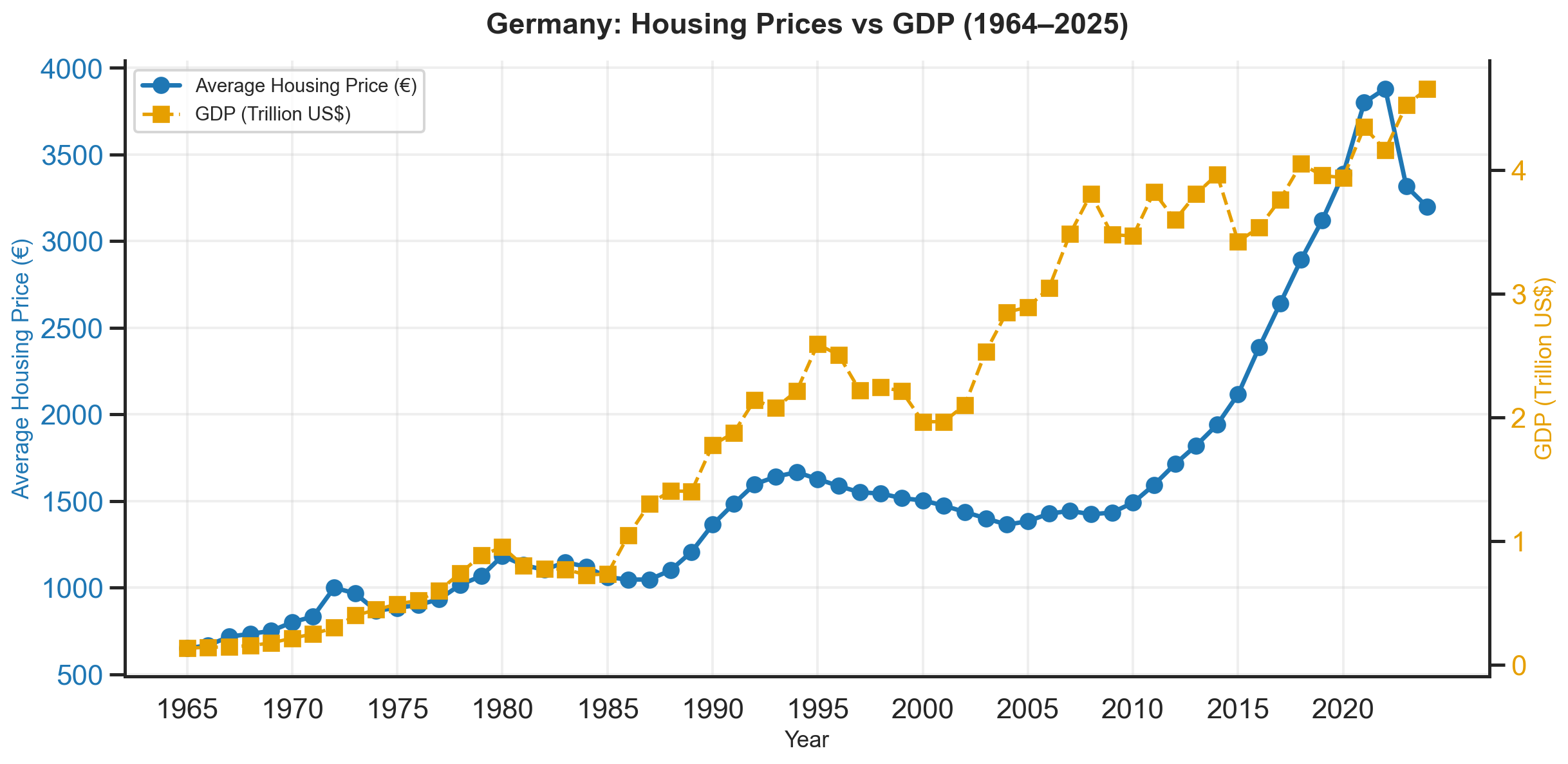 To relate housing price developments to broader economic conditions, housing prices are compared with Gross Domestic Product (GDP) for Germany. GDP reflects overall economic activity and income levels and is therefore a natural starting point when examining macroeconomic influences on the housing market.