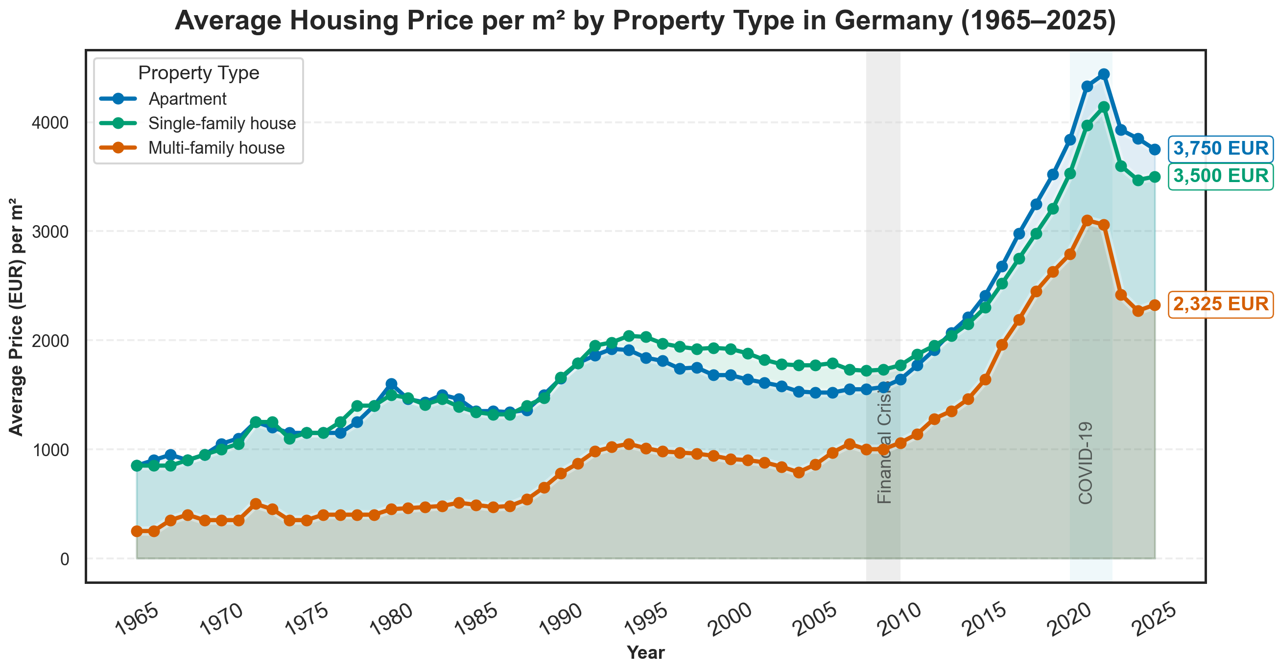 Figure 4: Average housing price per m² by property type in Germany (1965–2025, GREIX composite). Apartments, single-family, and multi-family houses have diverged especially after 2010. Key periods such as the financial crisis and COVID-19 are shaded.