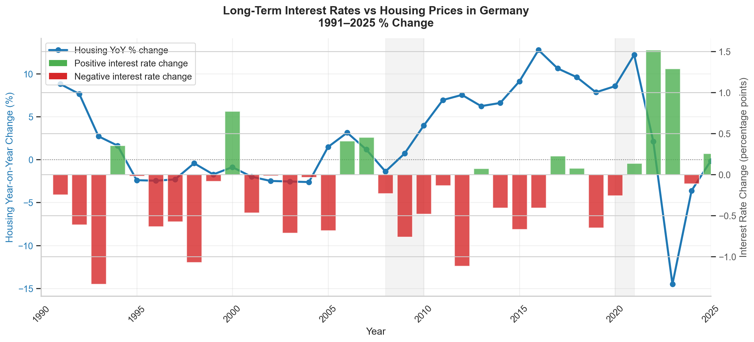 In addition to GDP, interest rates are an important macroeconomic factor for the housing market, as they directly affect borrowing costs for households. Figure 7 compares year-on-year housing price growth with changes in long-term interest rates in Germany over the period from 1991 to 2025.