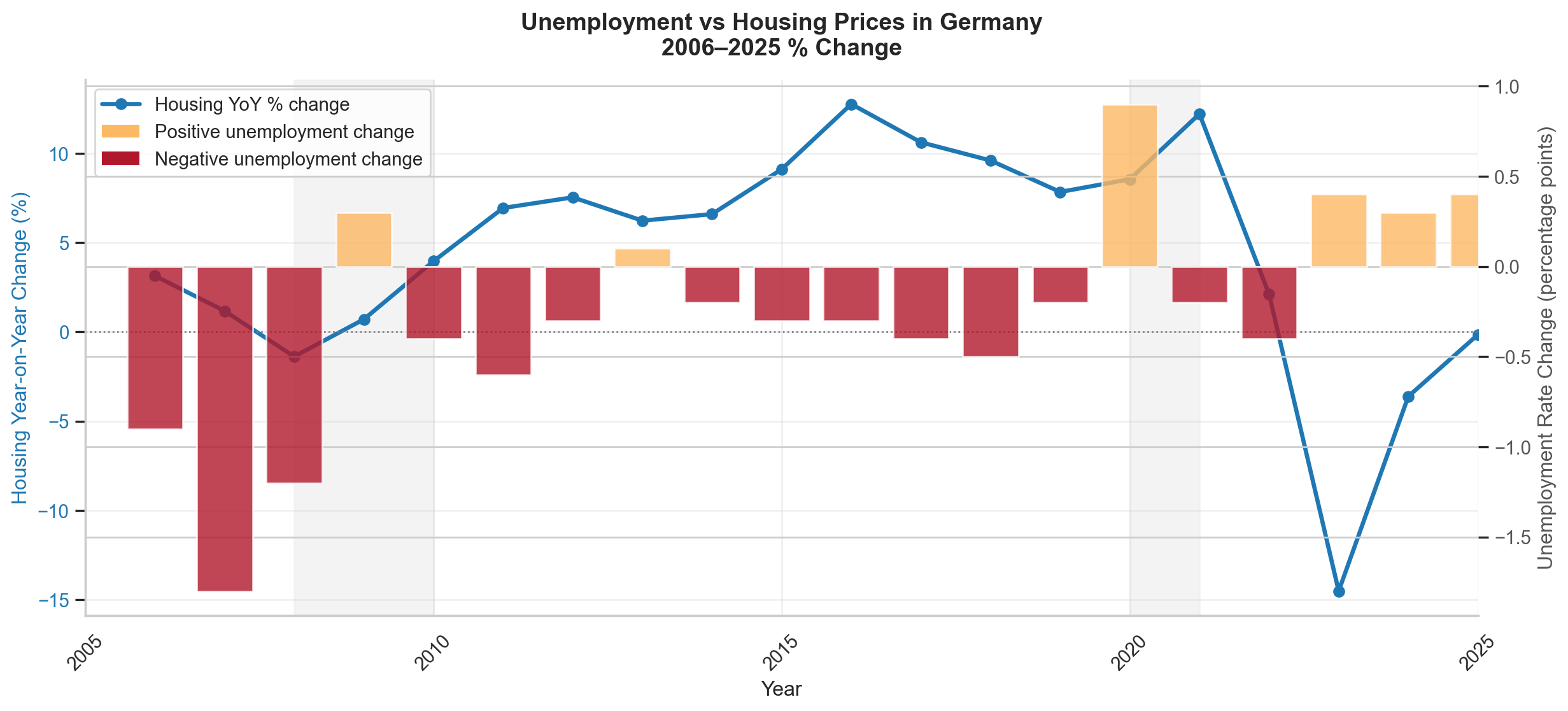 Figure 9: Unemployment versus housing prices: Year-on-year changes, Germany, 2006–2025.
