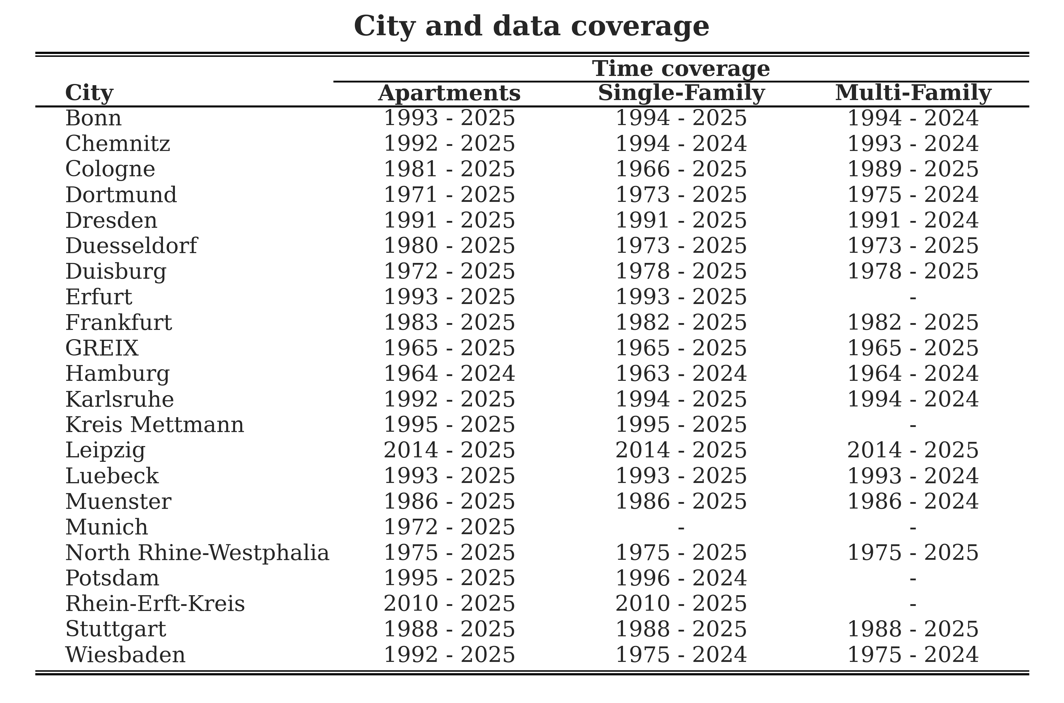 Table 1: City and data coverage for each property type and time range. This shows which years and property segments are available for each city in the GREIX dataset (apartments, single-family and multi-family houses)