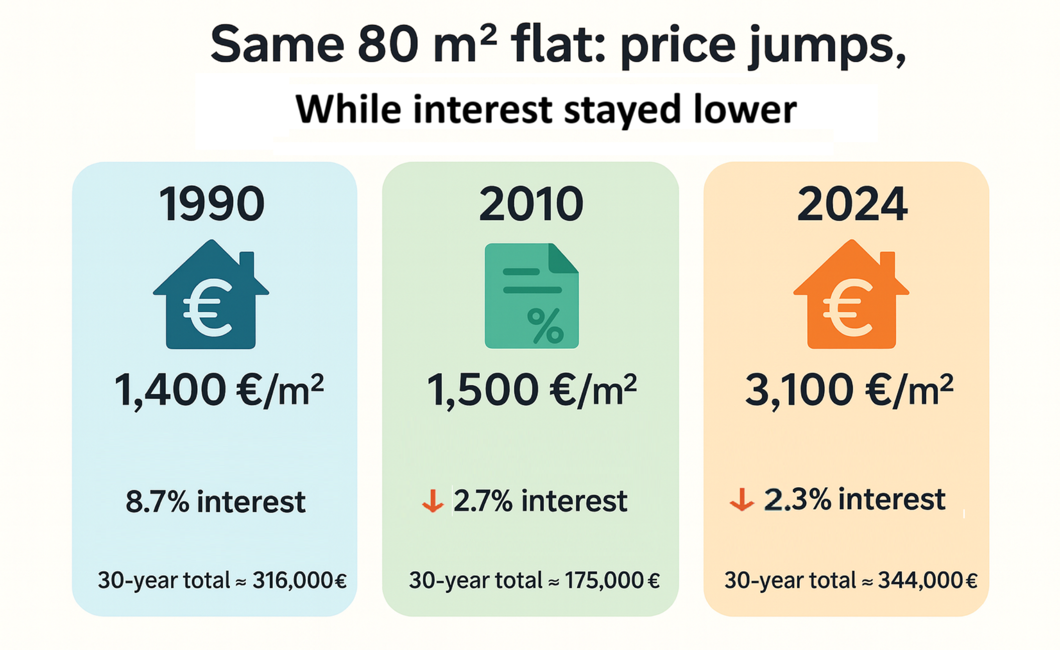 The Figure 10 compares the price of the same 80 m² flat at three points in time: 1990, 2010, and 2024. While interest rates declined strongly over time, housing prices increased substantially. In 1990, prices were relatively low, but interest rates were high. In 2010, interest rates dropped significantly, and housing prices increased only slightly. By 2024, interest rates remained low compared to the past, but housing prices more than doubled.